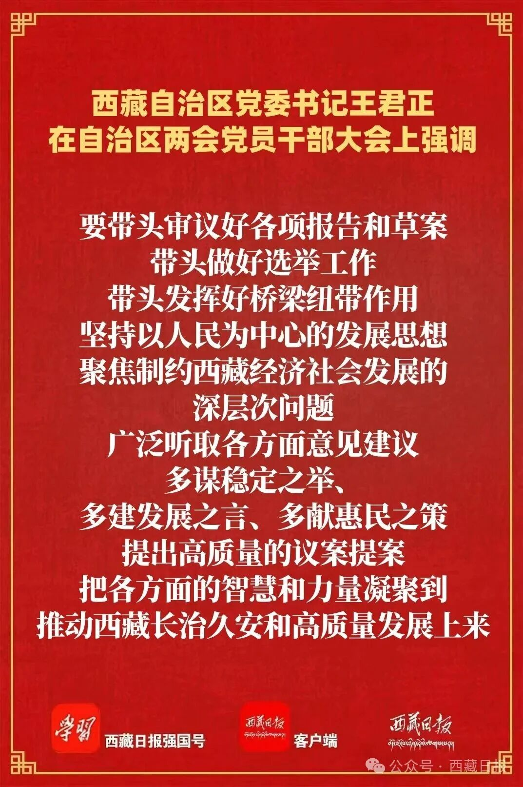 王君正强调,2026年是“十五五”开局之年,也是推进中国式现代化西藏实践的关键一年,开好今年自治区两会意义重大、责任重大。党员代表、委员要提高政治站位,深刻领悟“两个确立”的决定性意义,坚定坚决做到“两个维护”,始终在思想上政治上行动上同以习近平同志为核心的党中央保持高度一致;坚持不懈用党的创新理论武装头脑、指导实践、推动工作,努力掌握习近平新时代中国特色社会主义思想蕴含的科学世界观和方法论,自觉做党的创新理论的坚定信仰者和忠实实践者;用群众听得懂的语言和喜闻乐见的方式,把党的路线方针政策宣传到基层一线和群众中去,真正让大家听得懂、记得住、能领会、可落实。要弘扬理论联系实际的学风,围绕中心、服务大局,不断增强责任感使命感,依法履行职责、积极发挥作用,团结和带动全体代表、委员心往一处想、劲往一处使,自觉把西藏工作置于党和国家事业发展全局中思考研究、谋划推动,凝聚起推进中国式现代化西藏实践的强大合力。要带头审议好各项报告和草案,带头做好选举工作,带头发挥好桥梁纽带作用,坚持以人民为中心的发展思想,聚焦制约西藏经济社会发展的深层次问题,广泛听取各方面意见建议,多谋稳定之举、多建发展之言、多献惠民之策,提出高质量的议案提案,把各方面的智慧和力量凝聚到推动西藏长治久安和高质量发展上来。要严守政治纪律和政治规矩,把党的领导贯穿履职尽责全过程各方面,严格请示报告制度,严格遵守组织纪律、选举纪律和保密纪律,认真执行中央八项规定及其实施细则精神和自治区党委实施办法,树牢“过紧日子”思想,自觉约束自我、接受监督,集中精力开好两会。要坚持团结稳定鼓劲、正面宣传为主,多反映基层代表、委员的心声,讲好西藏故事、传递两会声音,让全区各族人民更好地了解两会、关注两会、支持两会。